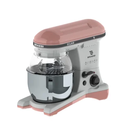 A batedeira possui um tacho em aço inoxidável com capacidade de 5 litros, permitindo a preparação de grandes quantidades de alimentos e facilitando a limpeza. Seu gabinete é feito de polímero injetado de alta resistência, e o chassi é de aço estampado com acabamento em pintura epóxi, garantindo durabilidade e qualidade.