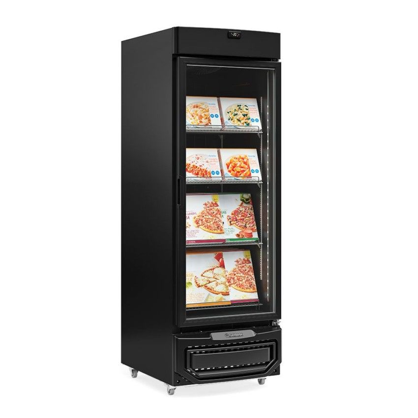Conservador Vertical Conservação e exposição de sorvetes e produtos congelados Refrigeração: Ar forçado com evaporador aletado Temperatura: -18° a -22°C Degelo: Automático Controlador eletrônico com indicador de temperatura Revestimento Interno: Aço pré-pintado preto Revestimento Externo: Aço pré-pintado preto Iluminação LED perimetral interno Porta de vidro duplo temperado baixo emissivo, com sistema de aquecimento Fechamento automático Porta com aquecimento Prateleiras aramadas 3 níveis reguláveis e inclináveis + estrado Gabinete com rodízios Vidros sujeitos a condensação da umidade do ar Equipamento(s) certificado(s) conforme Portaria Inmetro nº 148/2022 Produto destinado para uso comercial. * Imagens meramente ilustrativas. Imagens e informações sujeitas a alterações sem aviso prévio. ** Cores de acabamento e materiais sujeitos a variação de acordo com o lote de produção e/ou entre os materiais que compõem o produto (ex.: chapa, plástico,madeiras e etc.) Obs.: Não recomendamos o uso para sorvetes e açaís.
