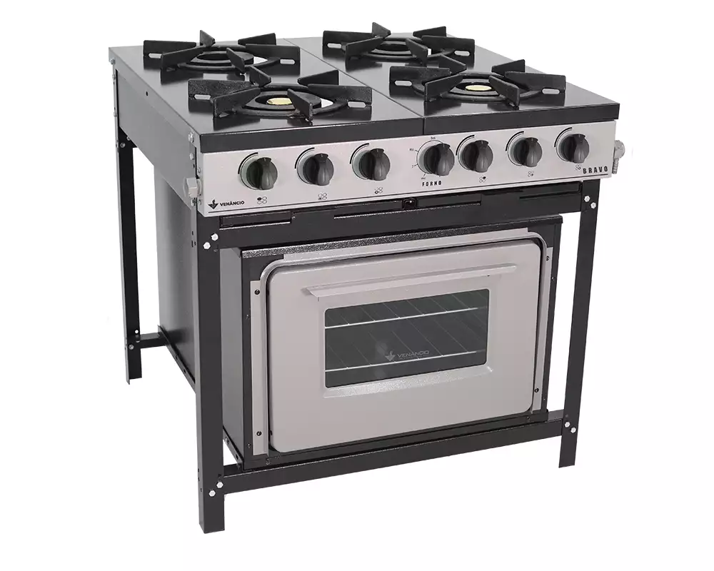 O Fogão 4 Bocas da Linha Bravo é um ótimo Fogão Industrial. Completo, ele conta com 2 bocas tripla chama, sistema de fechamento dos fornos por mola, mesa esmaltada e isolamento em lã de rocha.