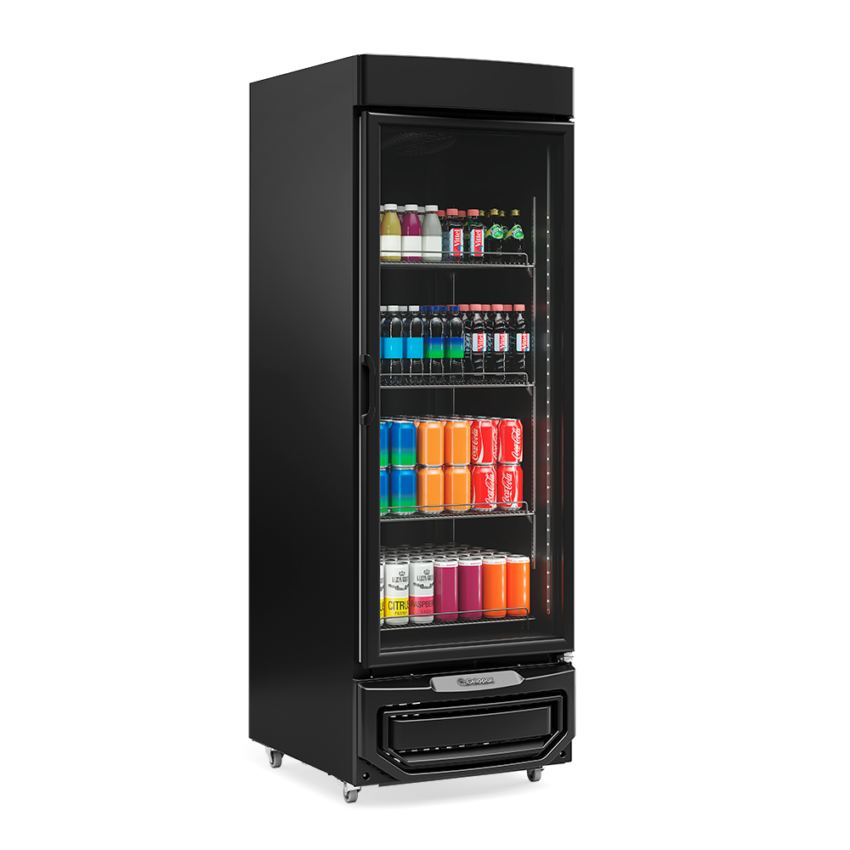 Refrigerador Vertical Conservação e Exposição de bebidas, frios e laticínios Refrigeração: Ar forçado com evaporador aletado Temperatura: 0 a +7C Degelo: Automático Controle de Temperatura: Termostato Revestimento Interno: Aço pré-pintado preto Revestimento Externo: Aço pré-pintado preto Iluminação LED perimetral interno Porta de vidro duplo temperado baixo emissivo Fechamento automático Prateleiras aramadas 5 níveis reguláveis e inclináveis Gabinete com rodízios Vidros sujeitos a condensação da umidade do ar Equipamento(s) certificado(s) conforme Portaria Inmetro nº 148/2022 Produto destinado para uso comercial. * Imagens meramente ilustrativas. Imagens e informações sujeitas a alterações sem aviso prévio. ** Cores de acabamento e materiais sujeitos a variação de acordo com o lote de produção e/ou entre os materiais que compõem o produto (ex.: chapa, plástico,madeiras e etc.)